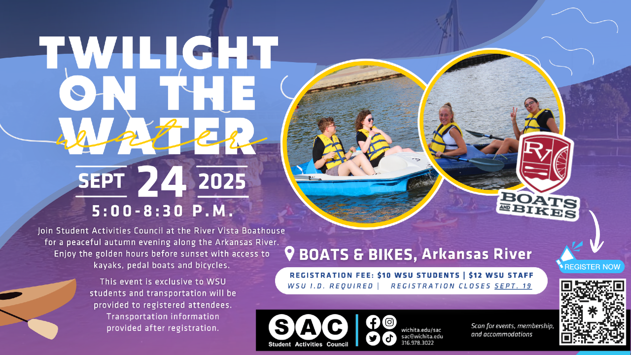 Join Student Activities Council at the River Vista Boathouse for a peaceful autumn evening along the Arkansas River. Enjoy the golden hours before sunset with access to kayaks, pedal boats and bicycles. This event is exclusive to WSU students and transportation will be provided to registered attendees. This event is from 5pm-8:30pm on Wednesday, Sept. 24.