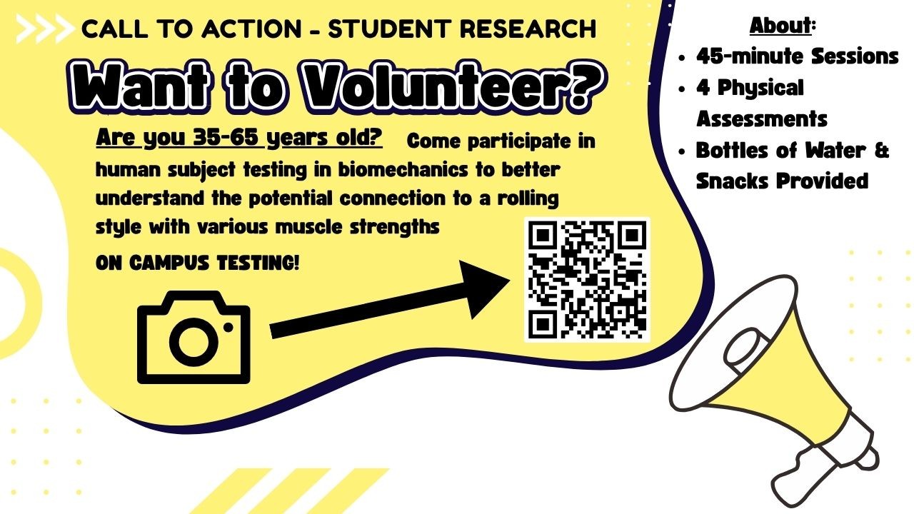 Are you 35-65 years old? Come participate in human subject testing in biomechanics to better understand the potential connection to a rolling style with various muscle strengths. The on-campus testing is around 45 minutes a session, is made up of four physical assessments, and there are bottles of water and snacks provided.