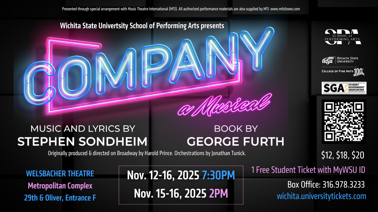 Wichita State University’s School of Performing Arts presents Company: A Musical with music and lyrics by Stephen Sondheim and a book by George Furth. Performances run November 12–16, 2025, at 7:30 p.m. and November 15–16 at 2 p.m. in the Welsbacher Theatre at the Metropolitan Complex, 29th and Oliver, Entrance F. Tickets are $12, $18, or $20, with one free student ticket available using a MyWSU ID. Visit wichita.universitytickets.com or call 316-978-3233 for details.