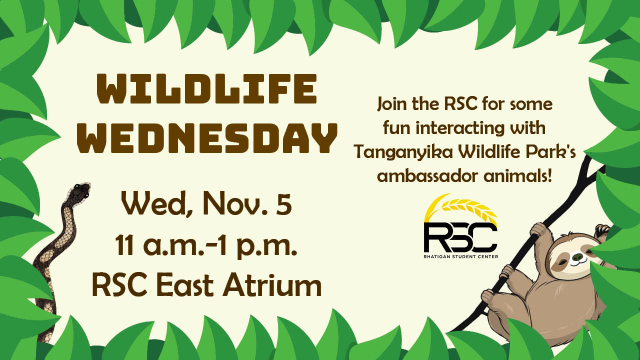 Join the RSC for Wildlife Wednesday. On Wednesday, Nov. 5 from 11 a.m.-1 p.m. in the RSC East Atrium, have some fun interacting with Tanganyika Wildlife Park’s ambassador animals.