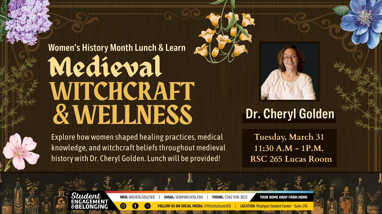 Explore how women shaped healing practices, medical knowledge, and witchcraft beliefs throughout medieval history with Dr. Cheryl Golden. Lunch Provided. Tuesday, March 31, 11:30 a.m. to 1 p.m. RSC Lucas Room