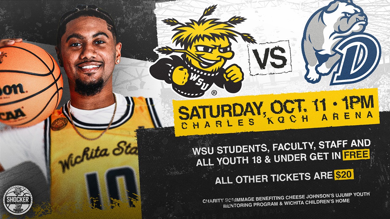 Wichita State Men’s Basketball hosts Drake in a charity scrimmage at Koch Arena this Saturday, Oct. 11 at 1pm. WSU students, faculty, staff and administration can claim a general admission ticket on game day at the Shocker Ticket Office for no cost with their WSU ID. All youth 18 and under can also claim a ticket at no cost. All other tickets are $20 with proceeds benefiting Cheese Johnson’s UJUMP Junior Mentoring Program and the Wichita Children’s Home. To purchase tickets, visit GoShockers.com/Tickets.